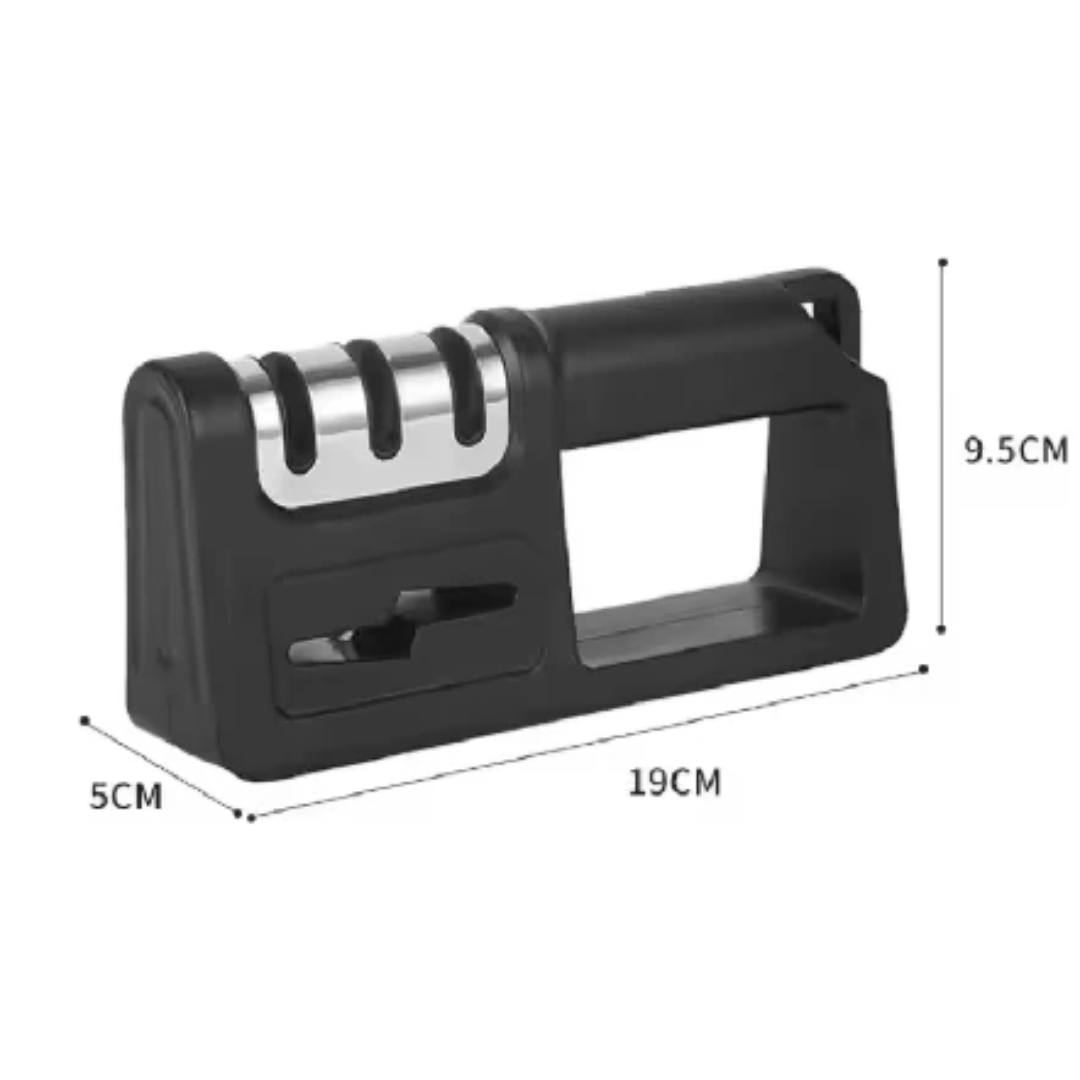 Portable 4-in-1 kitchen knife sharpener features a 3-stage manual design with diamond blade and ceramic sharpening stone, ensuring efficient blade sharpening for home kitchen use. Made of eco-friendly plastic and stainless steel, it offers durability and a modern non-slip base design, making it both functional and safe.