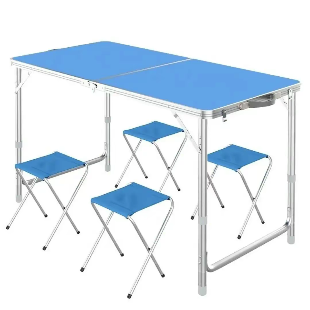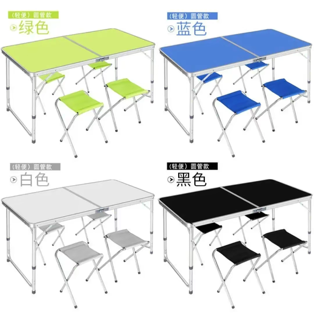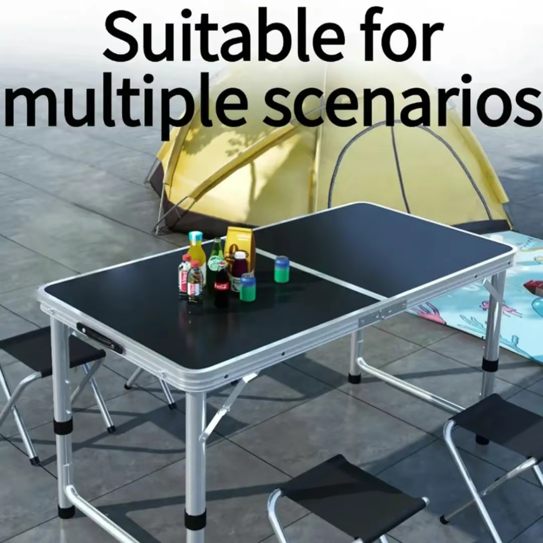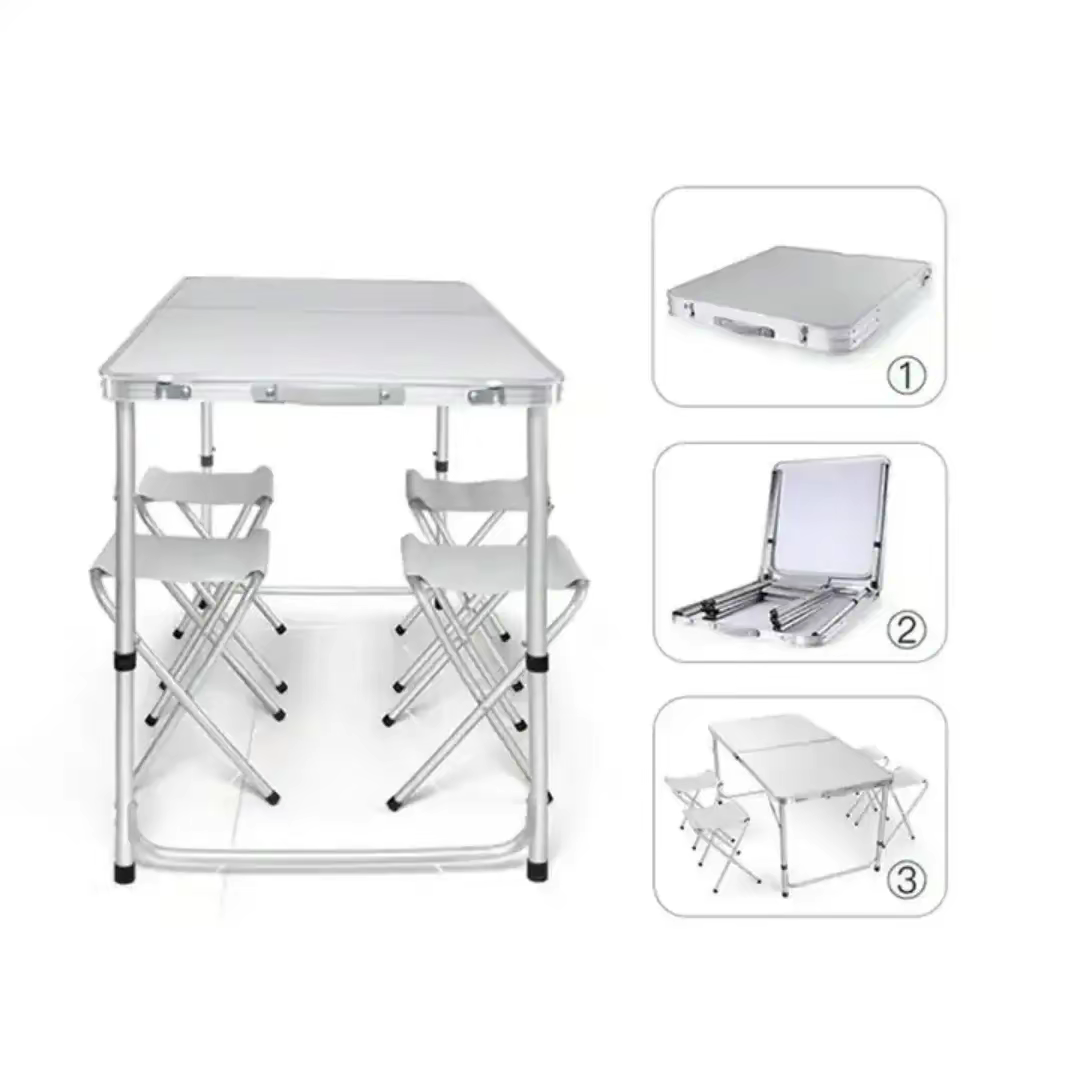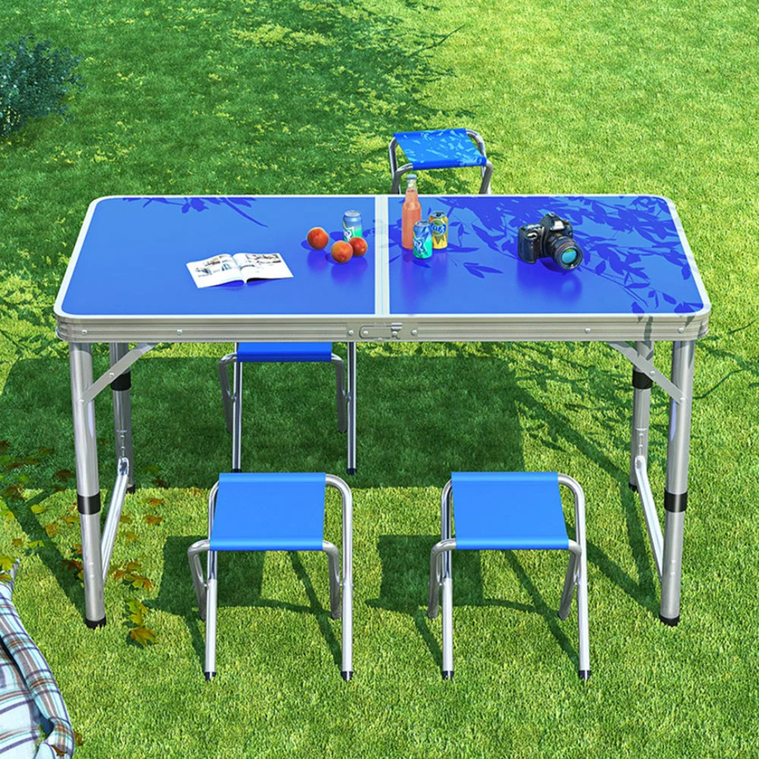 Portable folding table and chair set, ideal for outdoor activities like camping, picnics, or other gatherings.