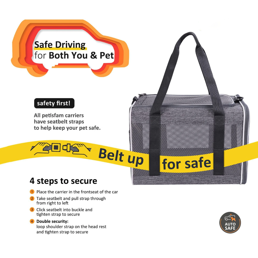 Petisfam soft pet carrier. This type of carrier is designed for comfortable and safe transport of pets, suitable for trips to the vet or car rides