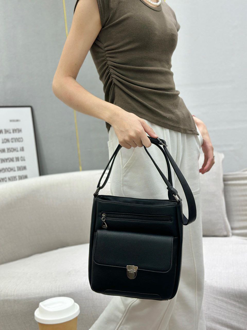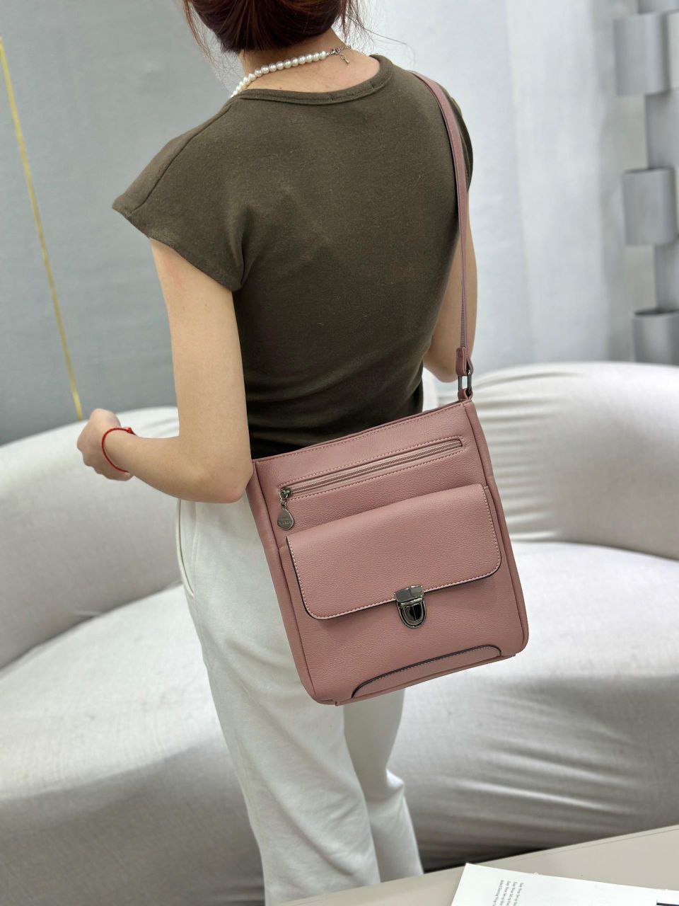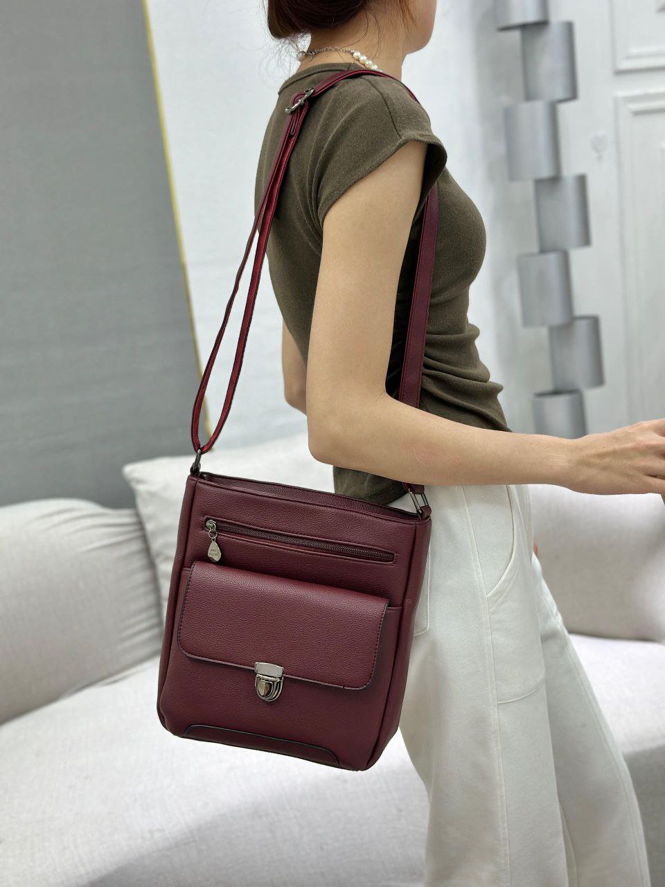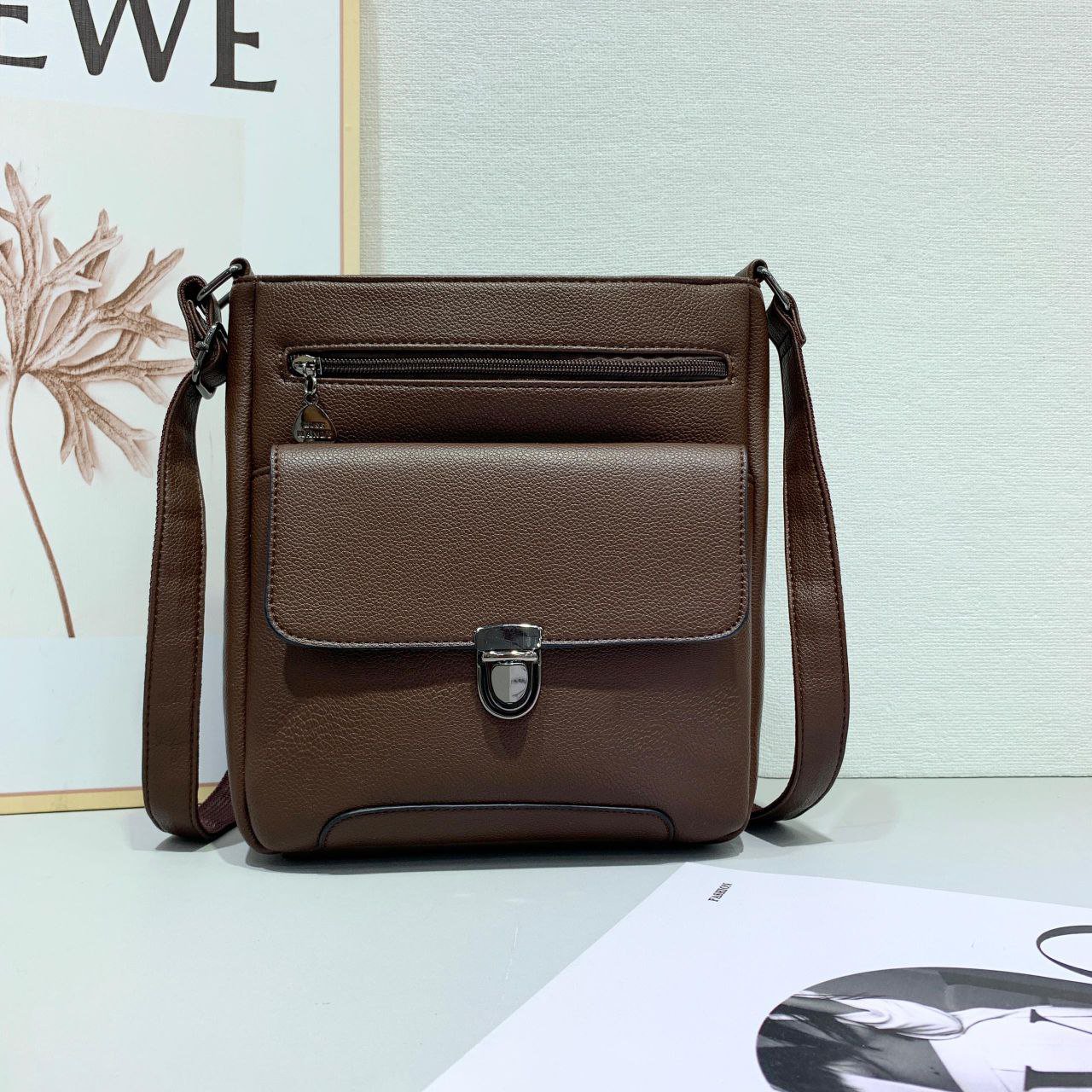 This bag is designed for versatility and can be worn across the body or on the shoulder. Its made of faux leather and features a flap closure with a clasp and an additional zippered pocket on the front.