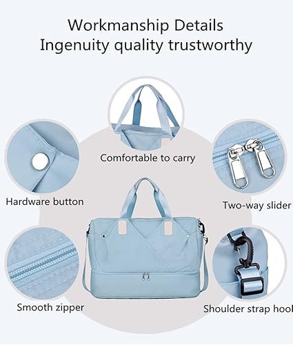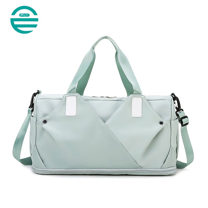 - Compartments It features a main zippered compartment, exterior pockets, and often includes a separate zippered compartment at the bottom specifically for shoes or wet items.